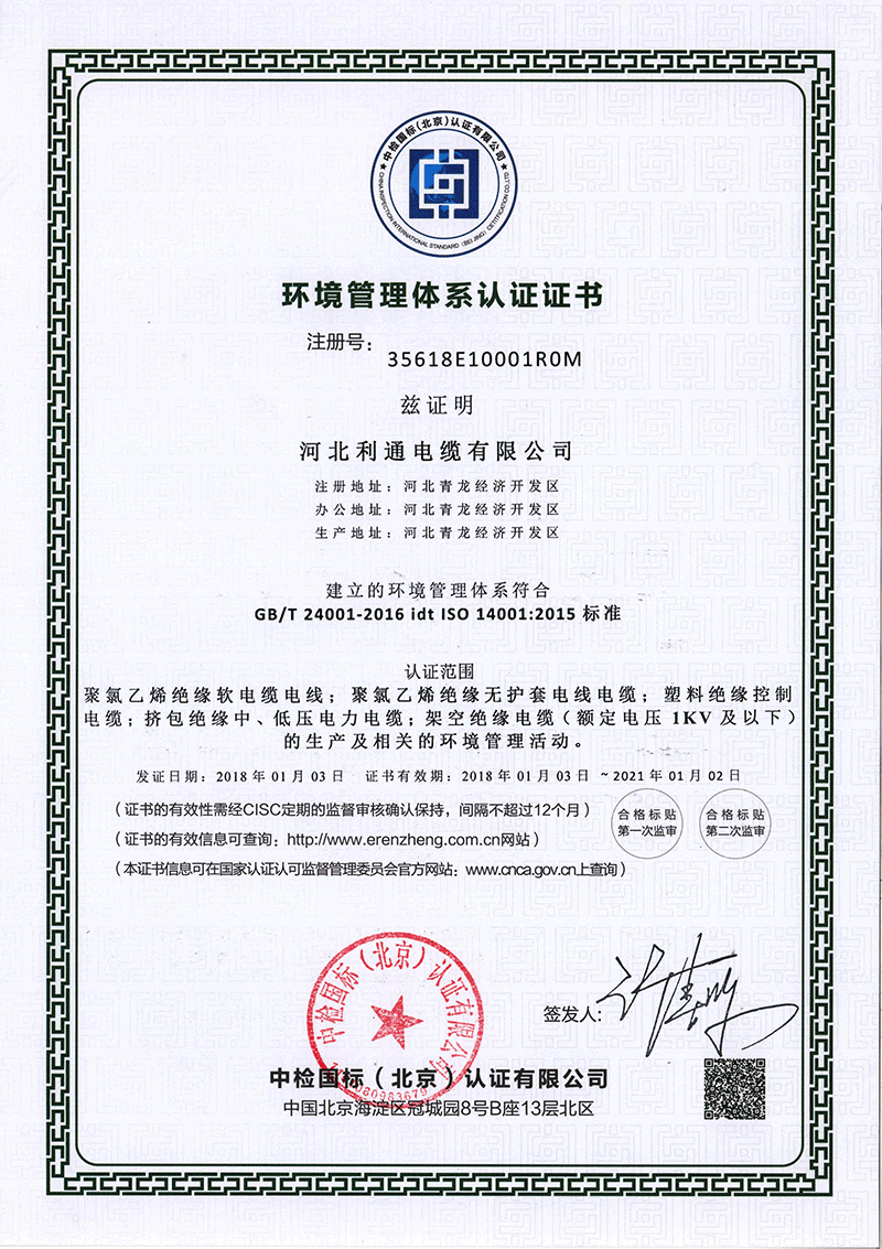 環境管理體系認證證書